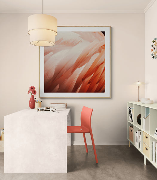 Modern fine art photograph of stunning pink flamingo feathers glowing in tropical light. Photographed by Alicia Bock.